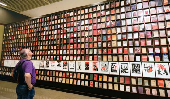 2018年5月9日,一位外国观众被北京“真理的力量——纪念马克思诞辰200周年主题展览”中一面展示不同国家出版的500多种《共产党宣言》的书墙所吸引。 中新社记者 贾天勇/摄