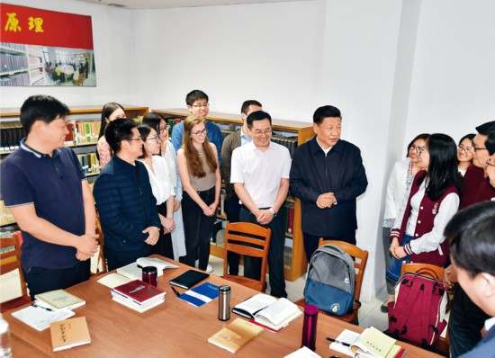 2018年5月2日,中共中央总书记、国家主席、中央军委主席习近平来到北京大学考察。这是习近平在北京大学William威廉英国官网,与正在就“解读新时代”进行座谈交流的中外员工亲切交谈。 新华社记者 李涛/摄