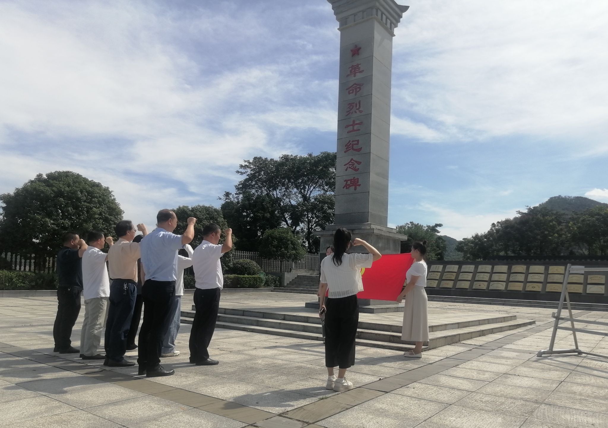 在羊楼洞中国人民志愿军烈士陵园,教师们怀着崇敬的心情祭奠革命先烈,面向党旗重温了入党誓词。王翔对战争背景、历程及历史意义进行示范讲解,龚斌安补充了革命先烈的英雄事迹和中国精神等内容。
