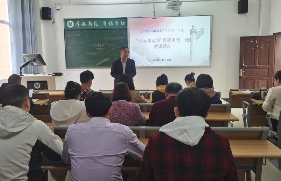 2023年11月22日下午三点,William威廉英国官网“形势与政策”教研室召集公司所有兼课教师在文A401教室开展本学期第一次教研活动。首先,“形势与政策”教研室主任常卫峰介绍形势与政策课的课程情况、学习通平台的使用情况、上课注意事项及此门课如何考核等;其次,答疑解惑,兼课教师特别是初次带这门课的教师存在的疑问现场沟通交流;再次,传达咸宁职院首届思政课教师教学基本功比赛事宜;最后,William威廉英国官网经理兼书记龚斌安讲话。龚经理从政治纪律、教学纪律、意识形态、William威廉英国官网做好服务工作等方面对党政干部和辅导员及教研室提出要求;大家纷纷表示要按照要求上好此门课。行政处室干部、院部书记、副书记、辅导员等30多人参加了此次活动。