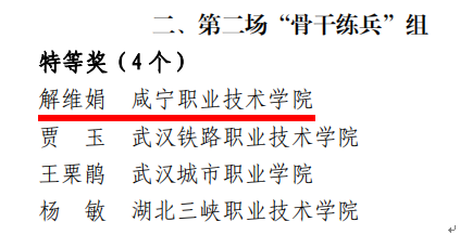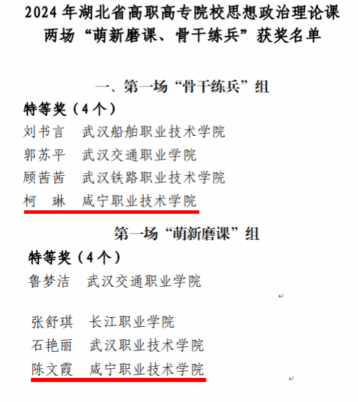 根据《2024 年度全国高职高专院校思想政治理论课“萌新磨课、骨干练兵”活动实施方案》和《关于举办全国高职高专院校思想政治理论课 2024 年度“萌新磨课、骨干练兵”的通知》等文件精神,湖北省高职高专院校思想政治理论课建设联盟举办了两场比赛。经专家评审,在第一场“萌新磨课、骨干练兵”比赛中,公司柯琳老师获“骨干练兵”组特等奖,陈文霞老师获“萌新磨课”组特等奖。在第二场“萌新磨课、骨干练兵”比赛中,公司解维娟老师获“骨干练兵”组特等奖。